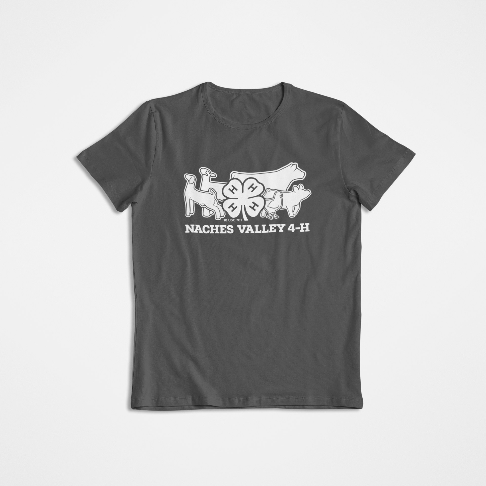 Introducing our Naches Valley 4-H Club Shirt – Crafted with comfort and longevity in mind, this shirt serves as a symbol of the diverse activities and learning experiences our 4-H Club has to offer. This 100% cotton shirt is dark charcoal gray with white screen print design.