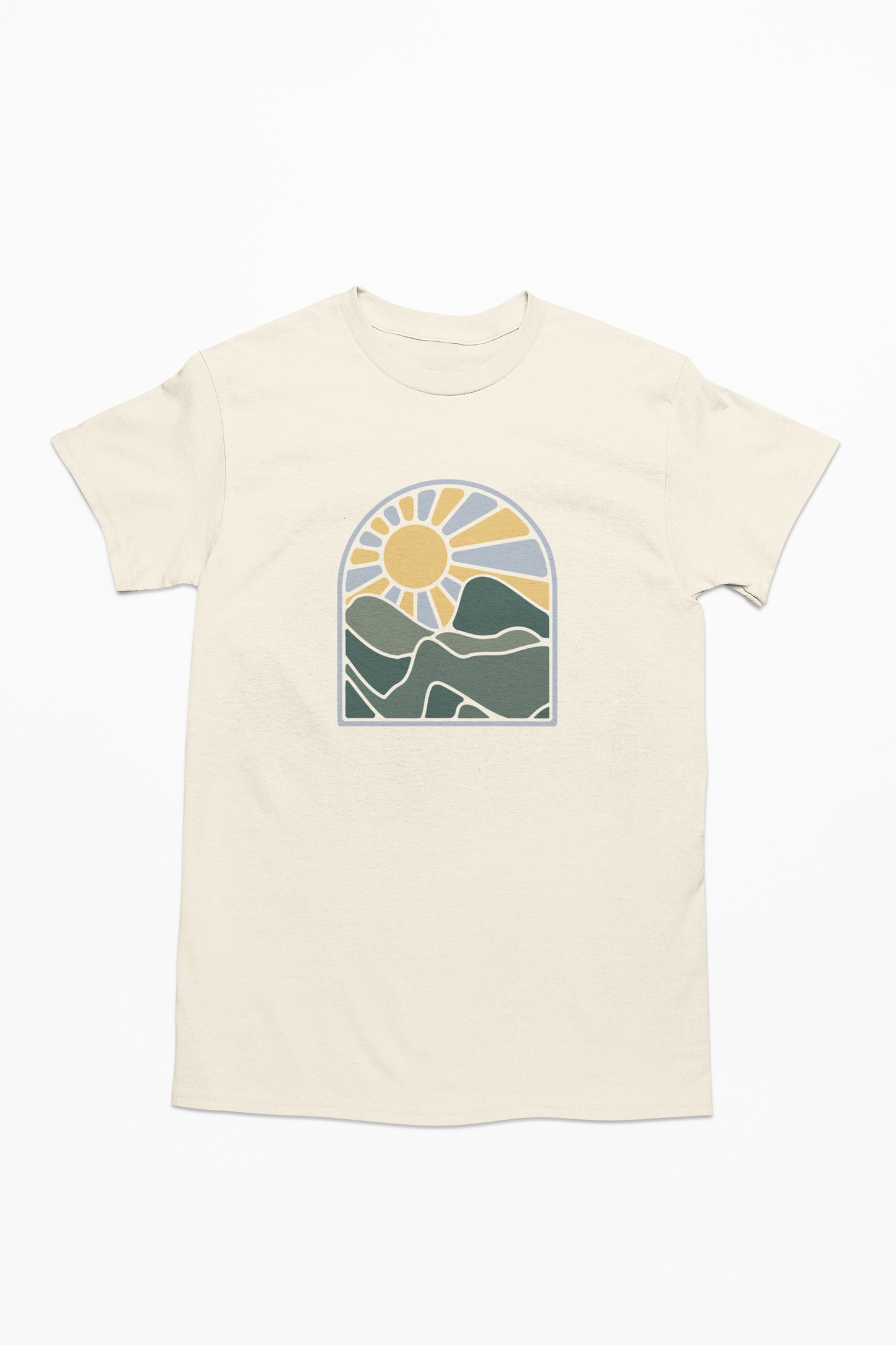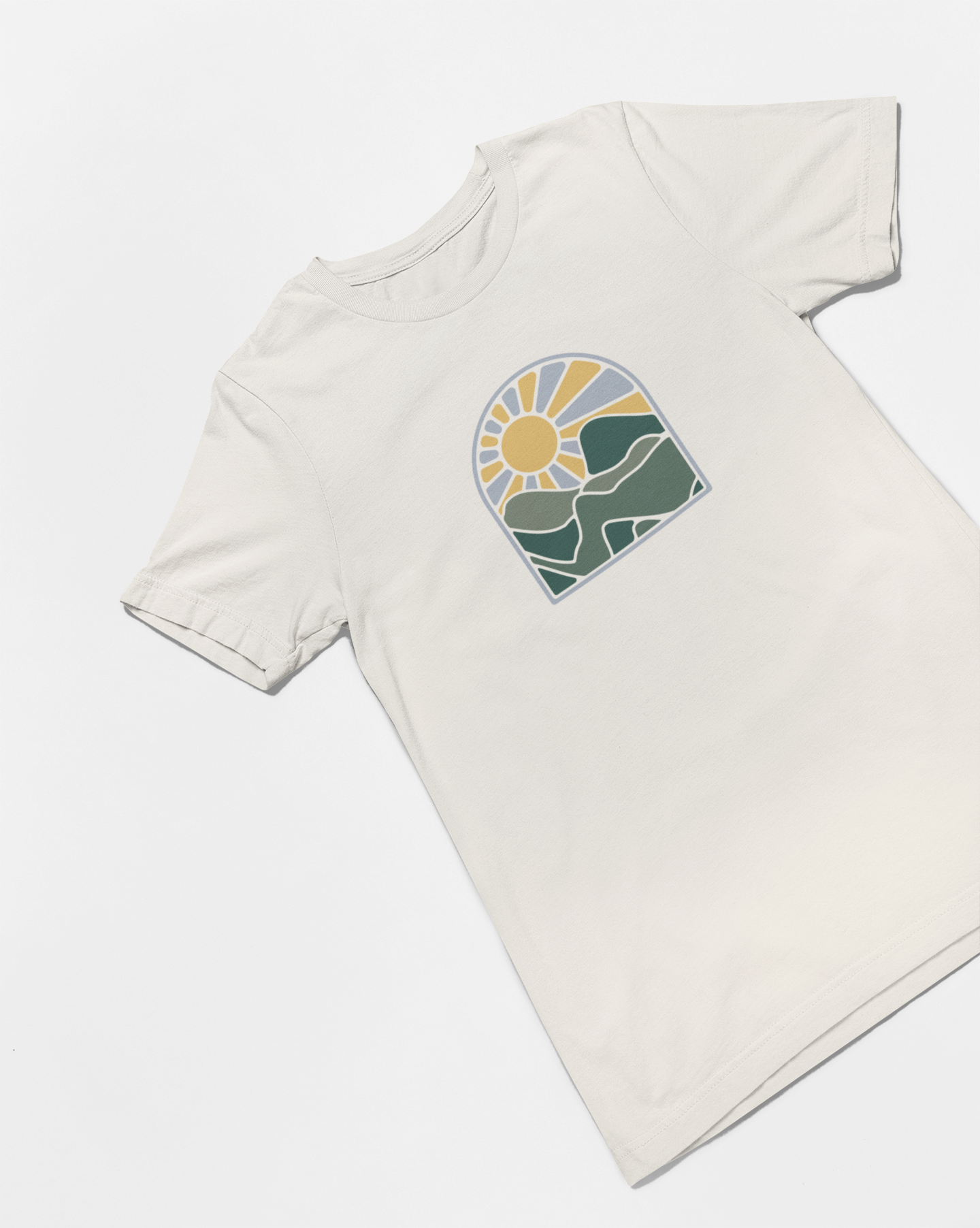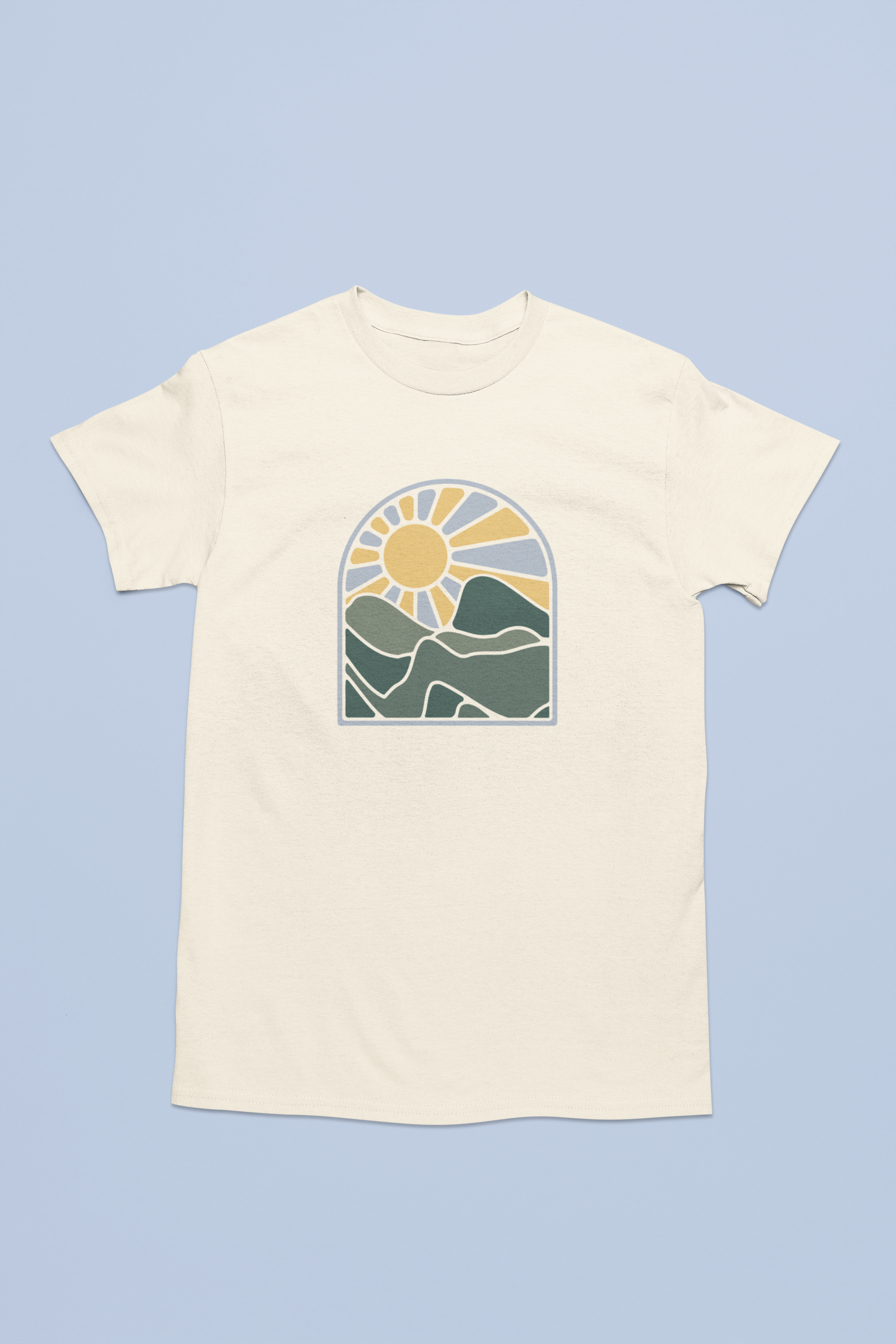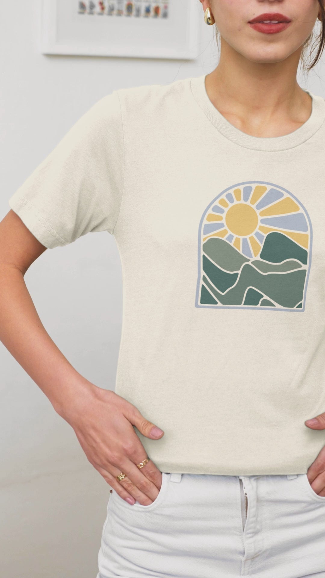 Stay trendy and comfortable with our April 2024 Shirt of the Month! Made from 100% cotton, this boho landscape shirt is perfect for warm weather. Update your wardrobe with a playful and unique twist! Available in a warm cream color and the sunshine design, this one is sure to uplift your mood when you wear it.