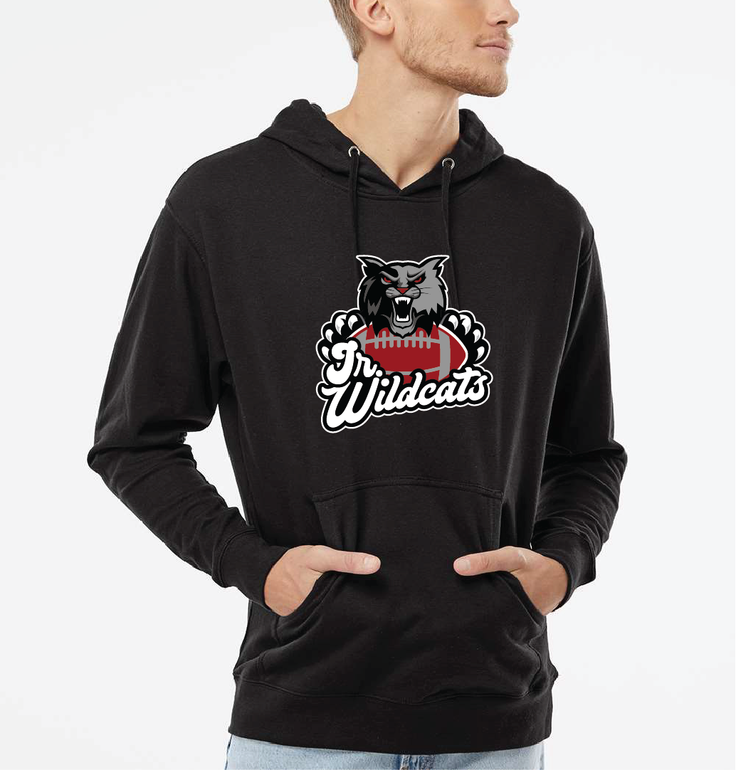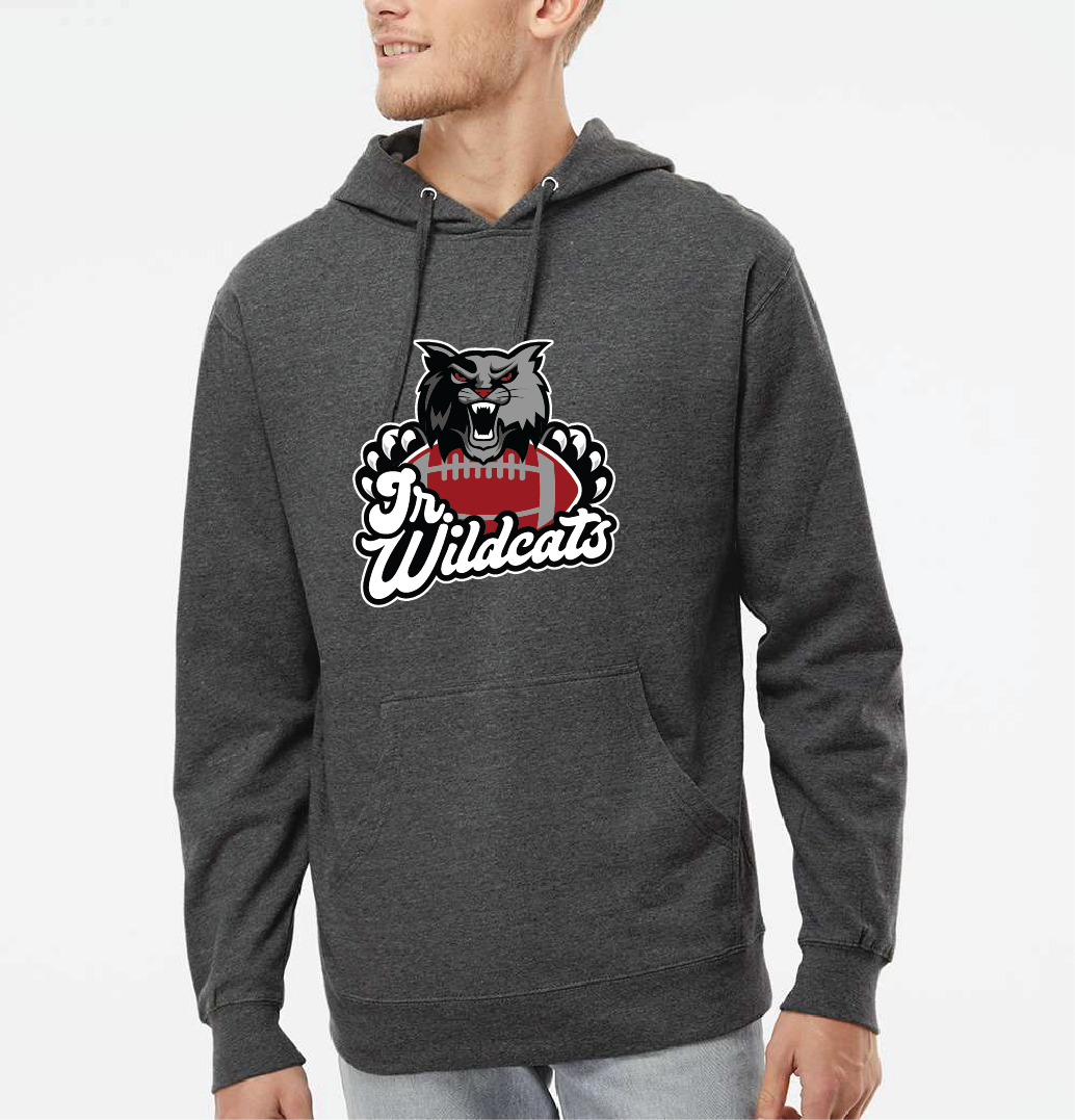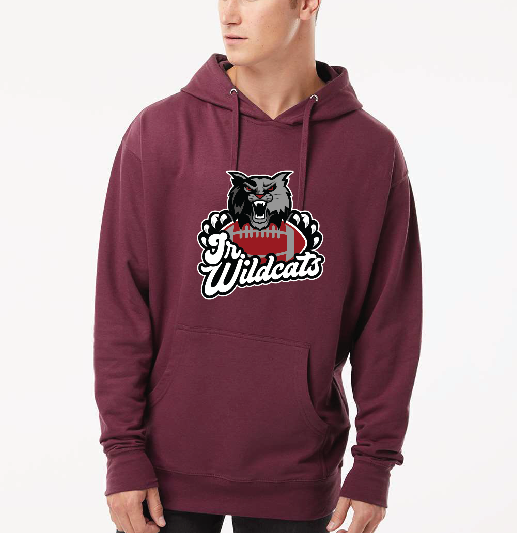 Stay warm and stylish all year round with our Jr. Wildcats Football Hoodie! Made of a soft 80/20 ring-spun cotton/polyester blend fleece, it's perfect for sports events and chilly days and will not shrink. Choose from black, charcoal gray, or maroon to show off your team spirit. Classic unisex fit. Please note: Youth sizes do not have drawstrings.