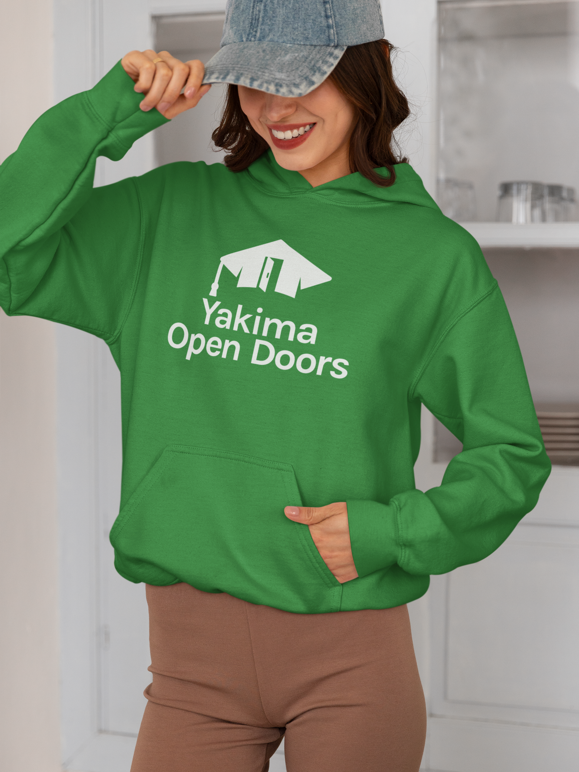 Stand out with our Open Doors Hoodie! Crafted from a polyester/cotton mix, this hoodie ensures durability and breathability for all-day wear, plus it will not shrink. The cozy blend guarantees a soft feel against your skin, making it ideal for school days or casual outings. Stay warm in style! Choose Kelly Green or Black colors ( both 80/20 cotton/poly blend).